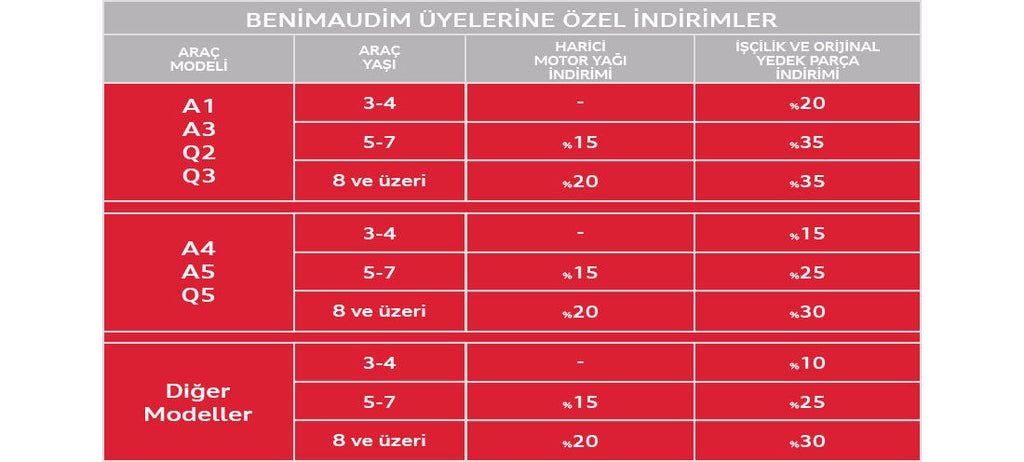 3 yaş ve üzeri Audi’niz için mekanik işçilik hizmetlerinde, Castrol yağlarda, araç lastiklerinde ve Audi Orijinal Parçalarında Benimaudim Segment İndirimi ayrıcalıkları Audi Yetkili Servislerinde sizi bekliyor.